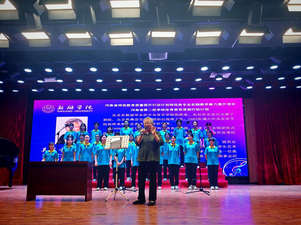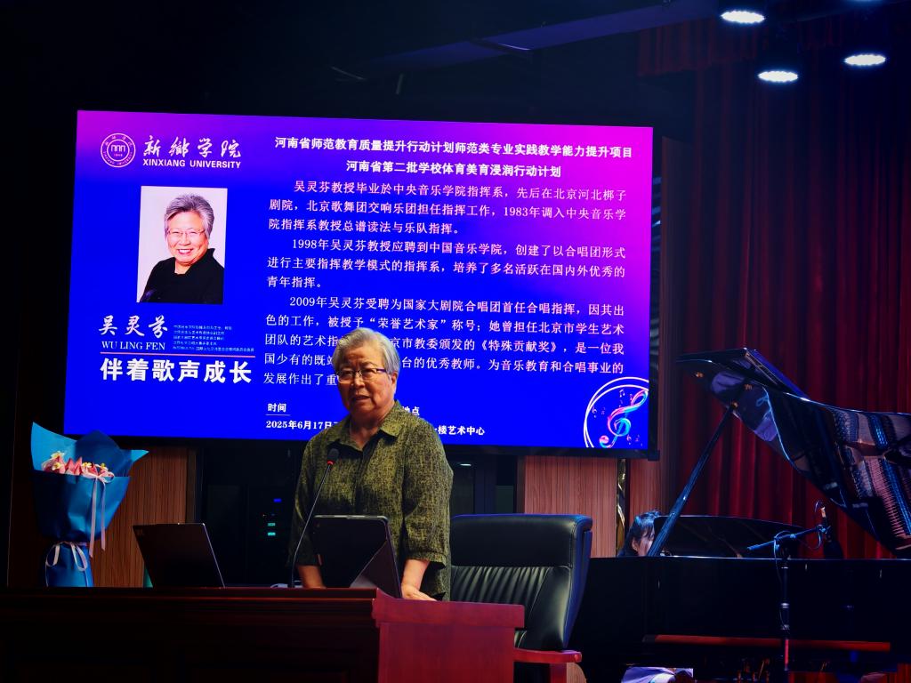 为深化落实“河南省第二批美育浸润行动计划”,全方位提升大中小学音乐教师专业素养与教学质量,6月17日,新乡市教育局联合新乡学院,在新乡学院行政楼一楼艺术中心举办"美育浸润"《伴着歌声成长——吴灵芬教授专项讲座》。
