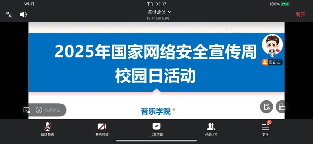上午9:30,音乐学院组织全院师生通过网络平台在线收看在河南师范大学举行的“2025年国家网络安全宣传周河南省校园日活动”启动仪式。活动聚焦防范网络诈骗、规范网络行为、保护个人信息等开展专题教育引导,进一步提升了师生的网络安全意识。